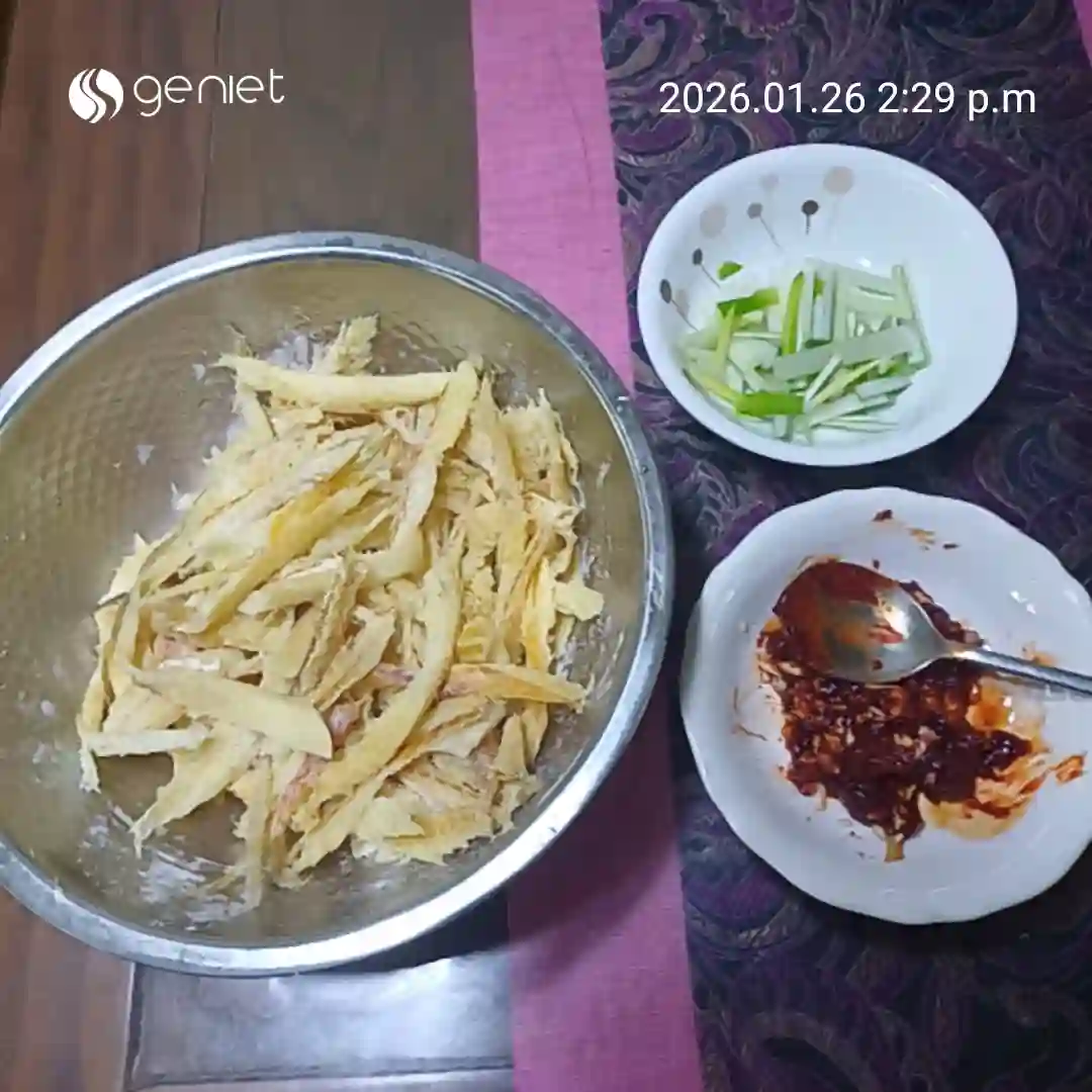 오늘은 황태채로 무침을 했어요. 단백질도 풍부하고 면역력 증강에 좋다고 하지요.