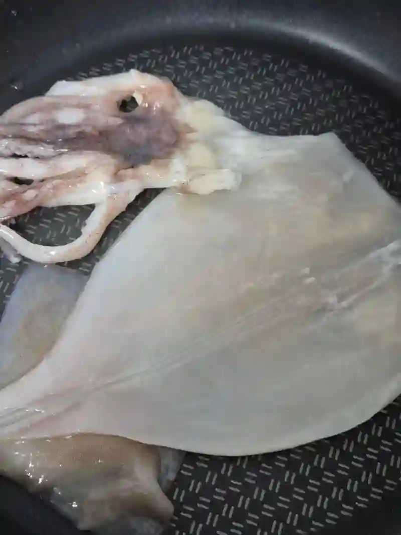 한봉지에 반건조 오징어 5미 총 500g인데 작은 오징어도 섞여 있어요. 5마리를 각각 한 마리씩 개별 포장을 한 다음 가장 큼직한 반건조 오징어 한 마리를 에어프라이가 아닌 후라이팬을 사용해서 구워보았어요. 버터와 아보카도 오일을 첨가해서 반건조 오징어를 구웠는데 개인적인 생각으로는 후라이팬은 좋은 조리법이 아닌 것 같아요.