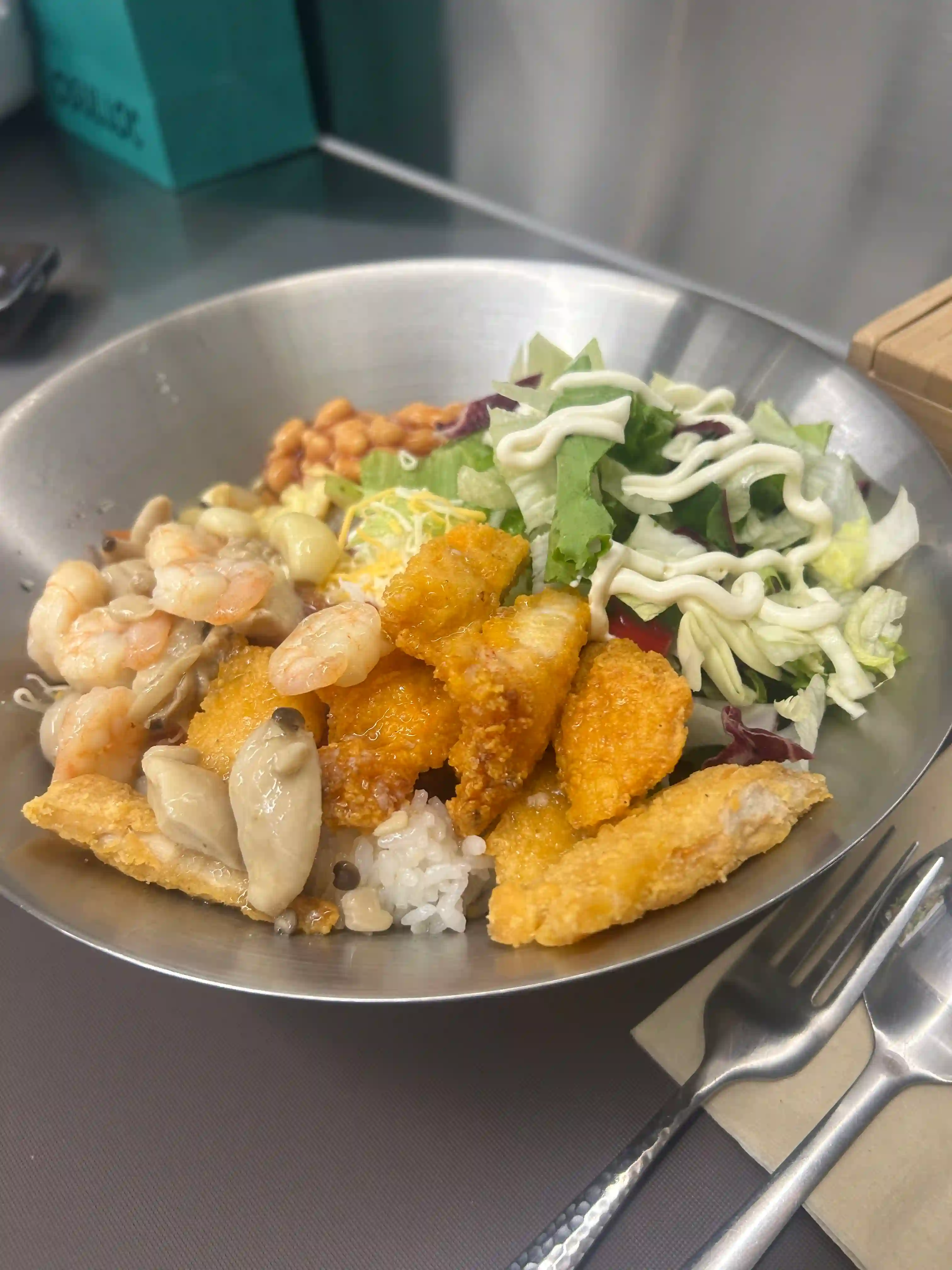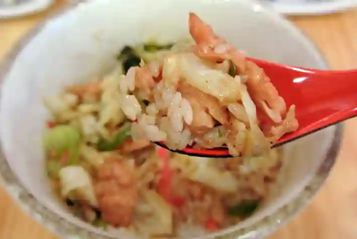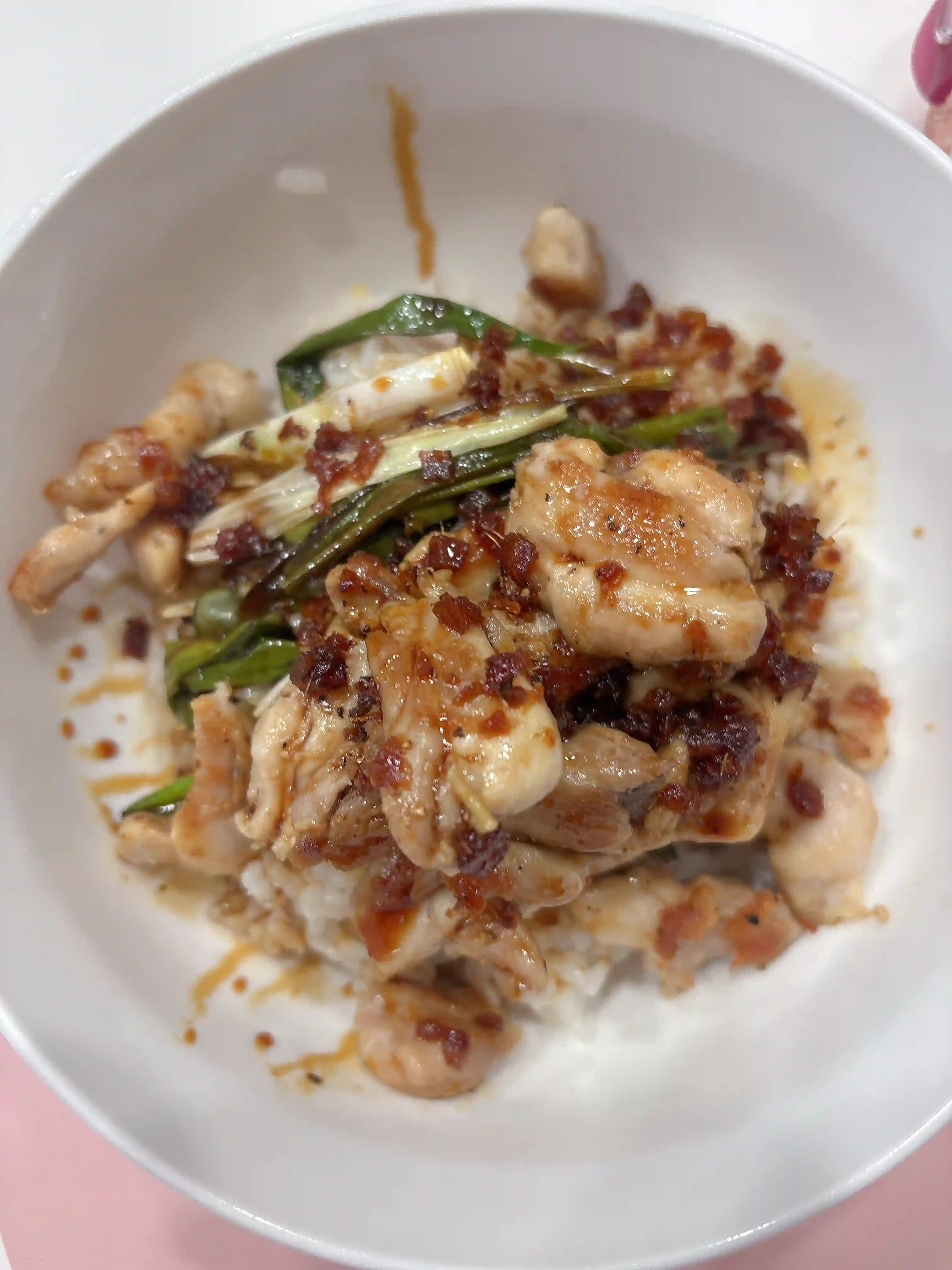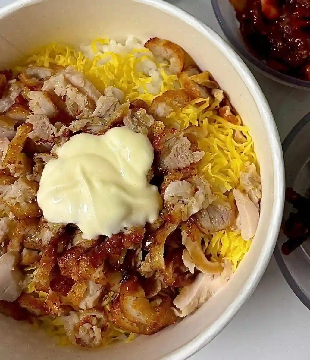 한 입 크게 떠먹어보니, 겉은 바삭하고 속은 촉촉한 치킨의 육즙이 입안에서 팡 터지네요. 밥알 사이사이 스며든 데리야끼 소스나 마요네즈의 부드러운 풍미가 치킨의 고소함과 어우러져 환상적인 조화를 이룹니다. 아삭하게 씹히는 양파 슬라이스나 송송 썬 쪽파가 중간중간 신선한 식감을 더해주어 자칫 느끼할 수 있는 뒷맛을 깔끔하게 잡아줍니다.